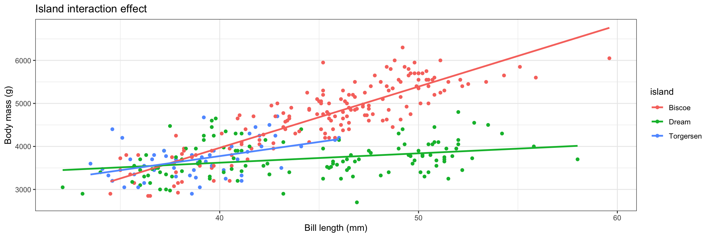 The relationship between penguin bill length and body mass depends on the penguin’s island.