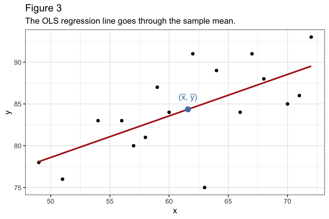 Show that the OLS regression line goes through \(\bar{x}, \bar{y}\). Reminder: \(\bar{x} = \frac{1}{n}\sum x_i\) and \(\bar{y} = \frac{1}{n} \sum y_i\)