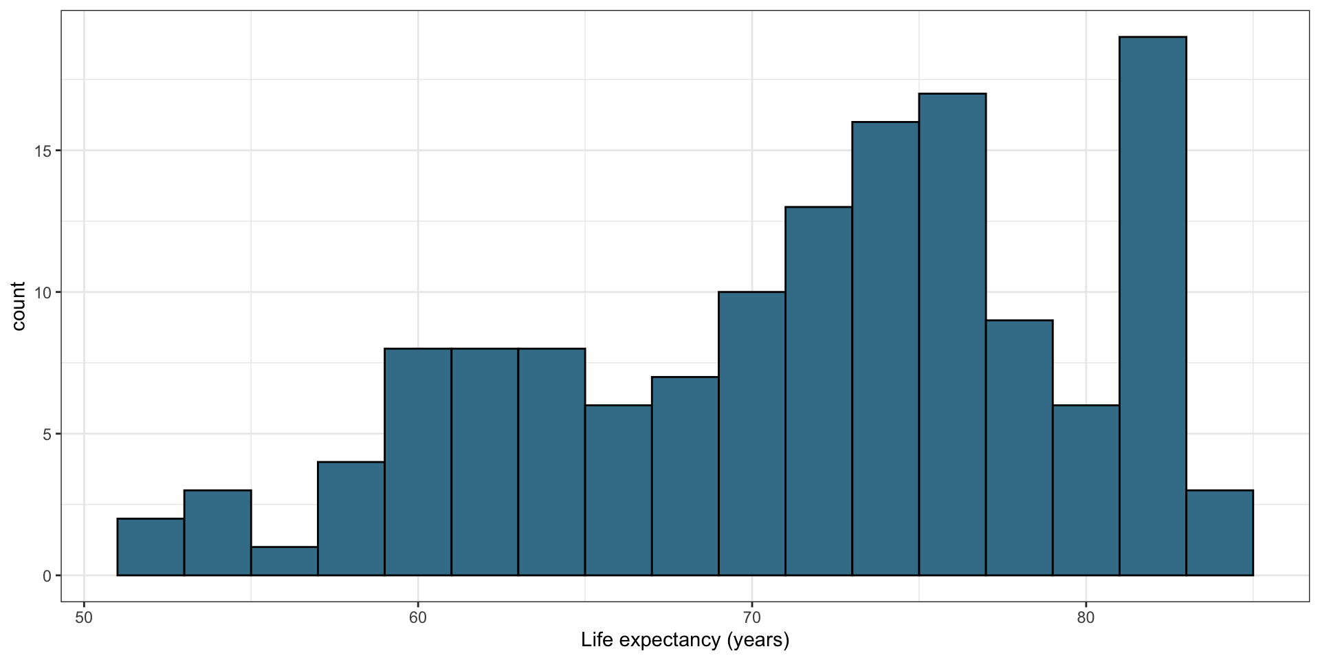 life_exp: The average number of years that a newborn could expect to live, if he or she were to pass through life exposed to the sex- and age-specific death rates prevailing at the time of his or her birth, for a specific year, in a given country, territory, or geographic area (from the World Health Organization).