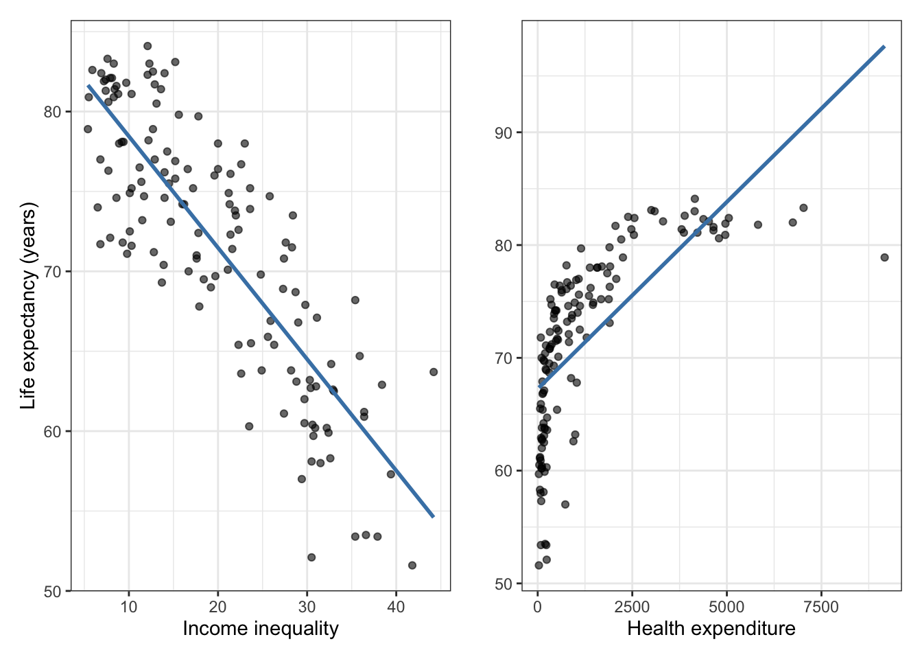 # Scatterplot of life expectancy vs income inequalityp1 <-ggplot(life_exp, aes(x = income_inequality, y = life_exp)) +geom_point(alpha =0.6) +geom_smooth(method ="lm", se =FALSE, color ="steelblue") +labs(x ="Income inequality",y ="Life expectancy (years)" ) +theme_bw()# Scatterplot of life expectancy vs health expenditurep2 <-ggplot(life_exp, aes(x = Health_expenditure, y = life_exp)) +geom_point(alpha =0.6) +geom_smooth(method ="lm", se =FALSE, color ="steelblue") +labs(x ="Health expenditure",y ="" ) +theme_bw()# Display plots side by side; uses patchwork pacakgep1 + p2