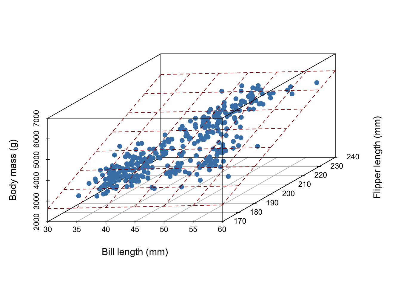 Now, imagine it’s hard to measure a penguin’s bodymass because it’s difficult to get them onto a scale. We wish to develop a linear model that uses bill length and flipper length to predict body mass,