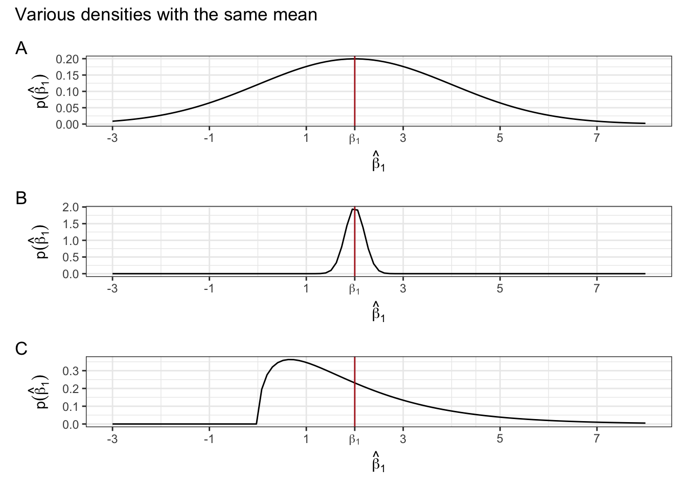 However, the result doesn’t tell us anything about how close \(\hat{\beta}\) will be to \(\beta\). The estimator may be unbiased, but by itself, this doesn’t tell us much. See examples of “unbiased” distributions of an estimator below.