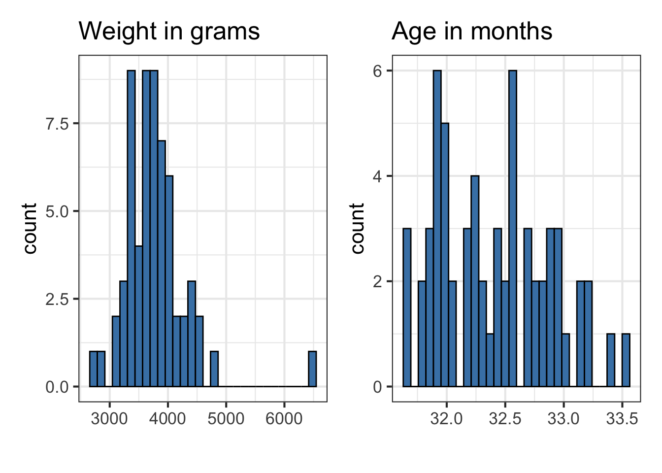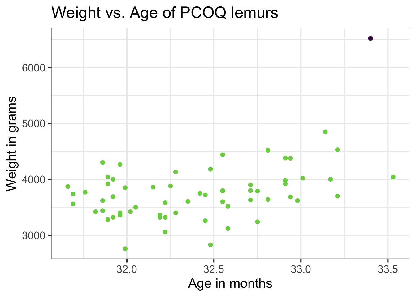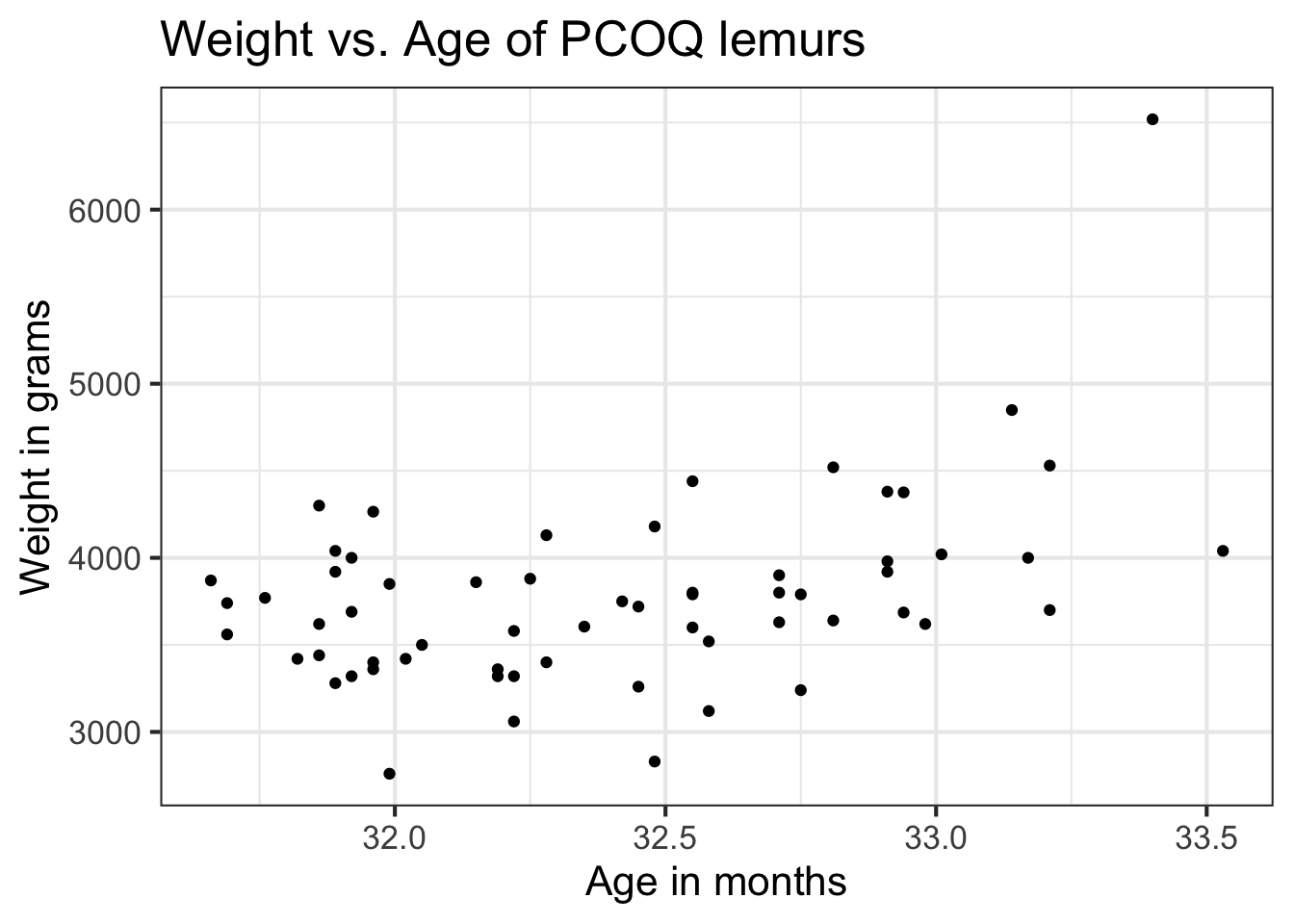# load packageslibrary(tidyverse) library(tidymodels) library(knitr) library(patchwork) library(viridis)lemurs <-read_csv("https://sta221-fa25.github.io/data/lemurs-pcoq.csv") |>filter(age_at_wt_mo <34)# set default theme in ggplot2ggplot2::theme_set(ggplot2::theme_bw(base_size =16))