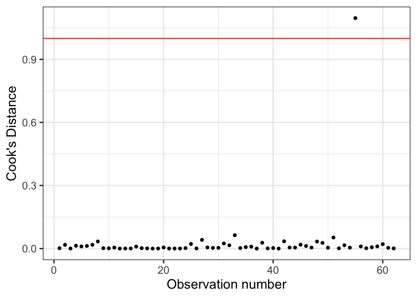 where \(r_i\) is the studentized residual and \(h_{ii}\) is the leverage for the \(i^{th}\) observation