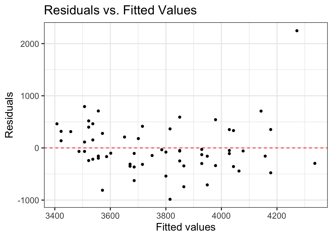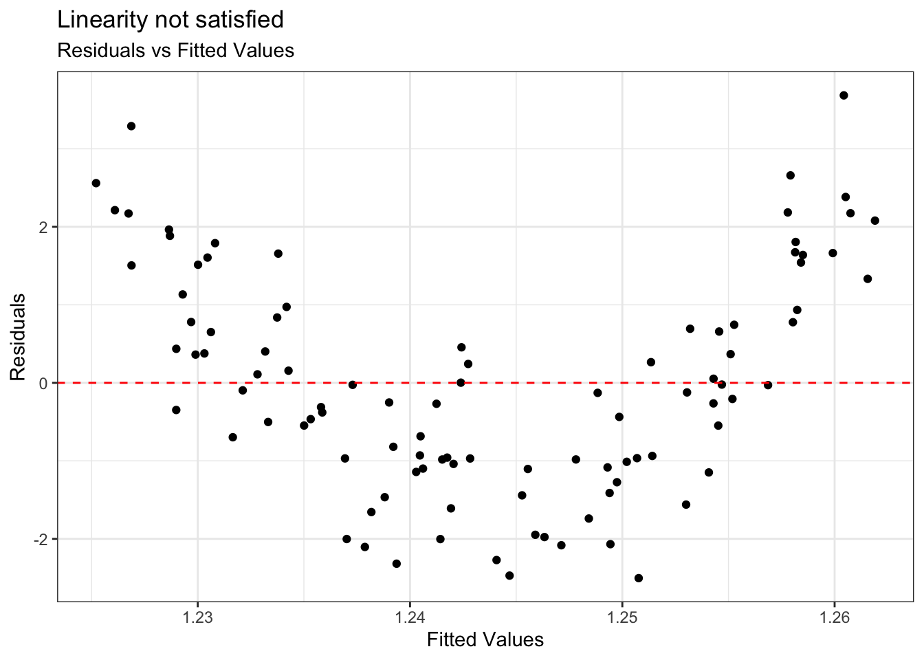 Linearity is satisfied if there is no discernible pattern in the plot (i.e., points randomly scattered around \(residuals = 0\)