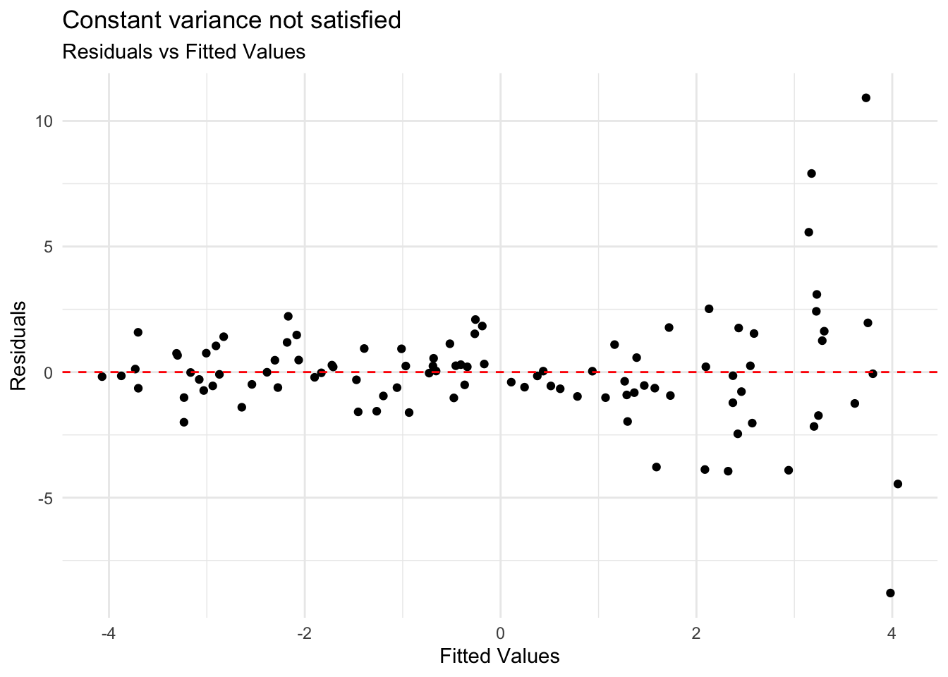 Constant variance is satisfied if the vertical spread of the points is approximately equal for all fitted values