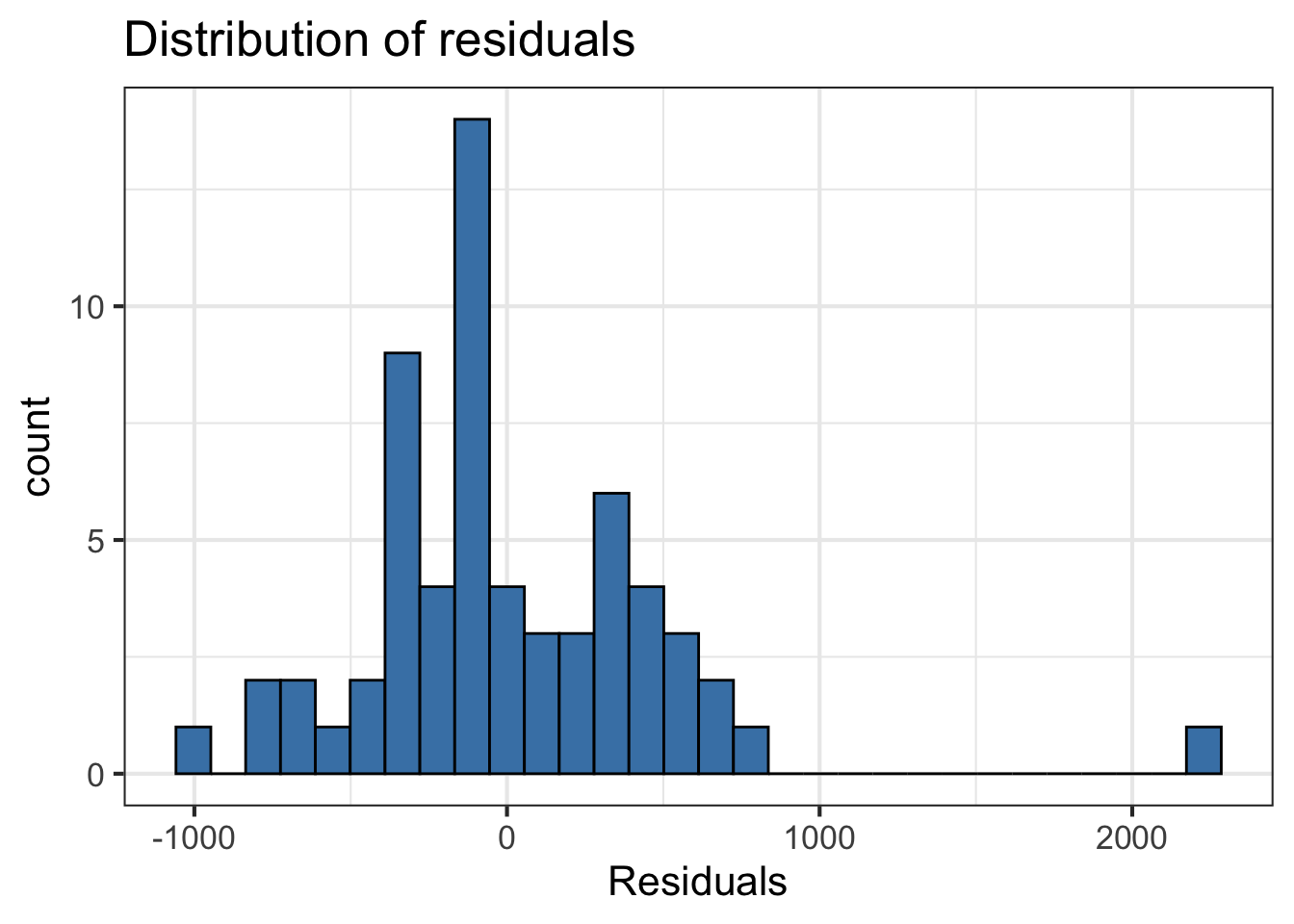 Normality:\(\varepsilon_i \sim Normal\). The distribution of the errors (residuals) is approximately normal.